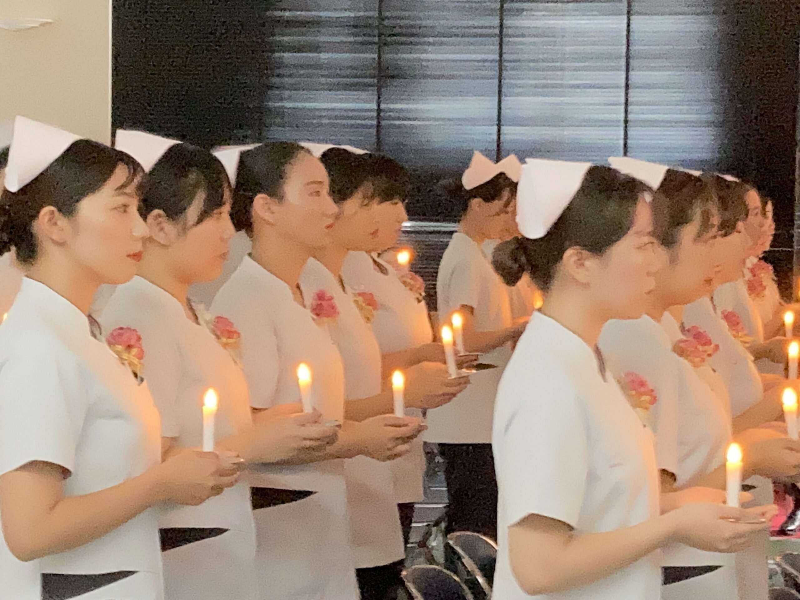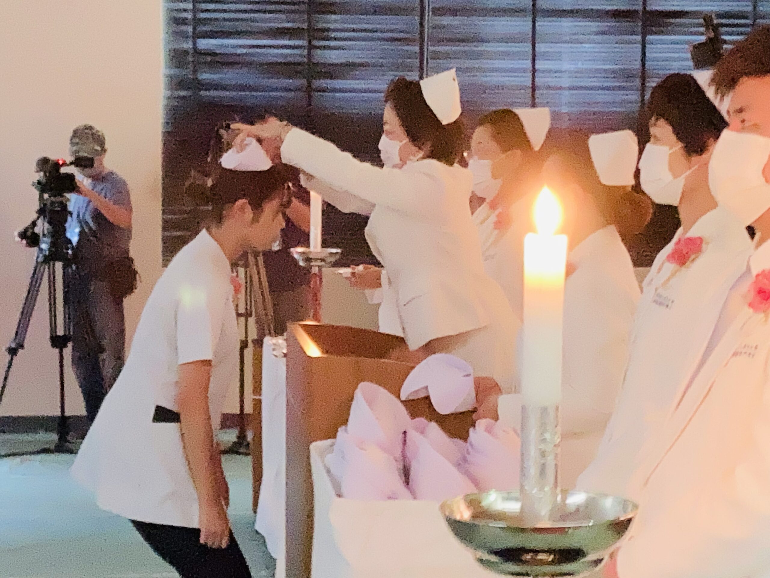 ご家族、ご来賓、関係者が参列し、キャンドルの灯のみの厳かな雰囲気の中、2年生76人に、白いナースキャップが与えられました。