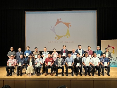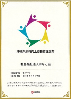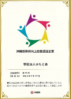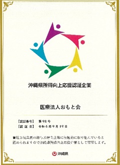 9月19日、那覇市の琉球新報ホールで開催された「所得向上応援企業認証式」において、おもと会グループ(社会福祉法人・医療法人・学校法人)が、それぞれ所得向上への取り組みが評価され、県内で97番目、98番目、99番目の企業として認証を受けました。