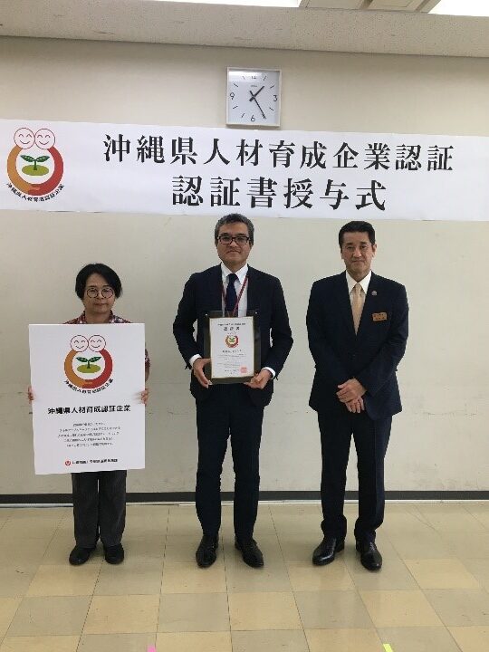 2024年11月19日(火)、沖縄県庁で行われた式典に参加し、沖縄県商工労働部 部長の松永様より、当法人の平良人事部長が認証書を受け取りました。今回認証されたのは、当会を含む以下の6社です。
