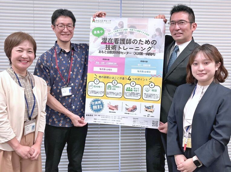 おもと会グループでは、子育てや介護などの理由で離職した「潜在看護師」の復職を支援するため、毎月2回、採血などの技術トレーニング研修を実施しています。キャッチコピーは「安心して失敗できる場所、何度でも練習できる場所」。復職に向けた一歩を踏み出すための環境づくりを目指しています。2023年度からスタートしたこの取り組みでは、これまでに延べ18人が研修を受講しています。