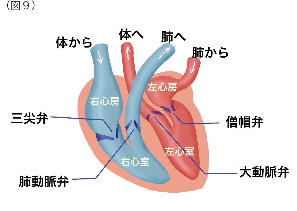 心臓は4つの部屋で構成されますが、各部屋の出口のところに弁膜と呼ばれる膜状の構造物があります(図9)。これらの弁膜は心臓を通過する血液の逆流を防ぐ重要な役割をしています。弁膜のトラブルとしては、錆びついて開きが悪くなる「狭窄」と全体が歪むなどして閉まりが悪くなる「閉鎖不全」が知られています。狭窄や閉鎖不全によって心臓に「圧負荷」や「容量負荷」がかかると、やがて心不全に至ります。失神や胸痛、動悸、息切れなどの症状とともに、致死的不整脈などによる突然死を来たす油断ならない病気です。
