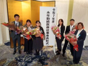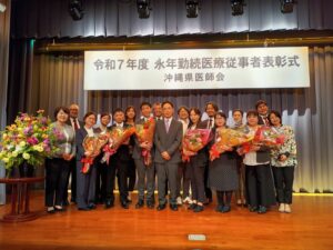 ✨**永年勤続医療従事者表彰式に参加しました!**✨ 令和7年11月、沖縄県医師会主催の表彰式が「ダブルツリーbyヒルトン那覇首里城」で開催されました。 当院からは 栄養給食科・リハビリテーション科・地域医療連携センター・7階病棟・医療情報課 より勤続20年の職員6名が表彰されました👏👏👏 式典と懇親会には病院長や各部長も出席し、長年のご尽力に感謝の気持ちを伝える素敵な時間となりました。 受賞された皆さま、本当におめでとうございます!これからもよろしくお願いします😊